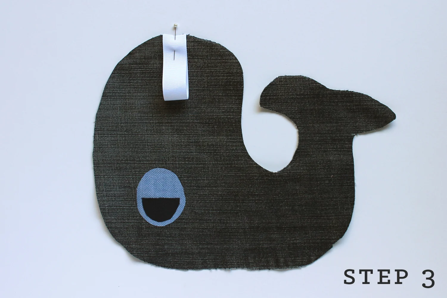 Cut a 6 inch piece of ribbon. Fold in half and pin raw edges to top of whale head. Baste in place. Pin body pieces right sides together and stitch between circles.