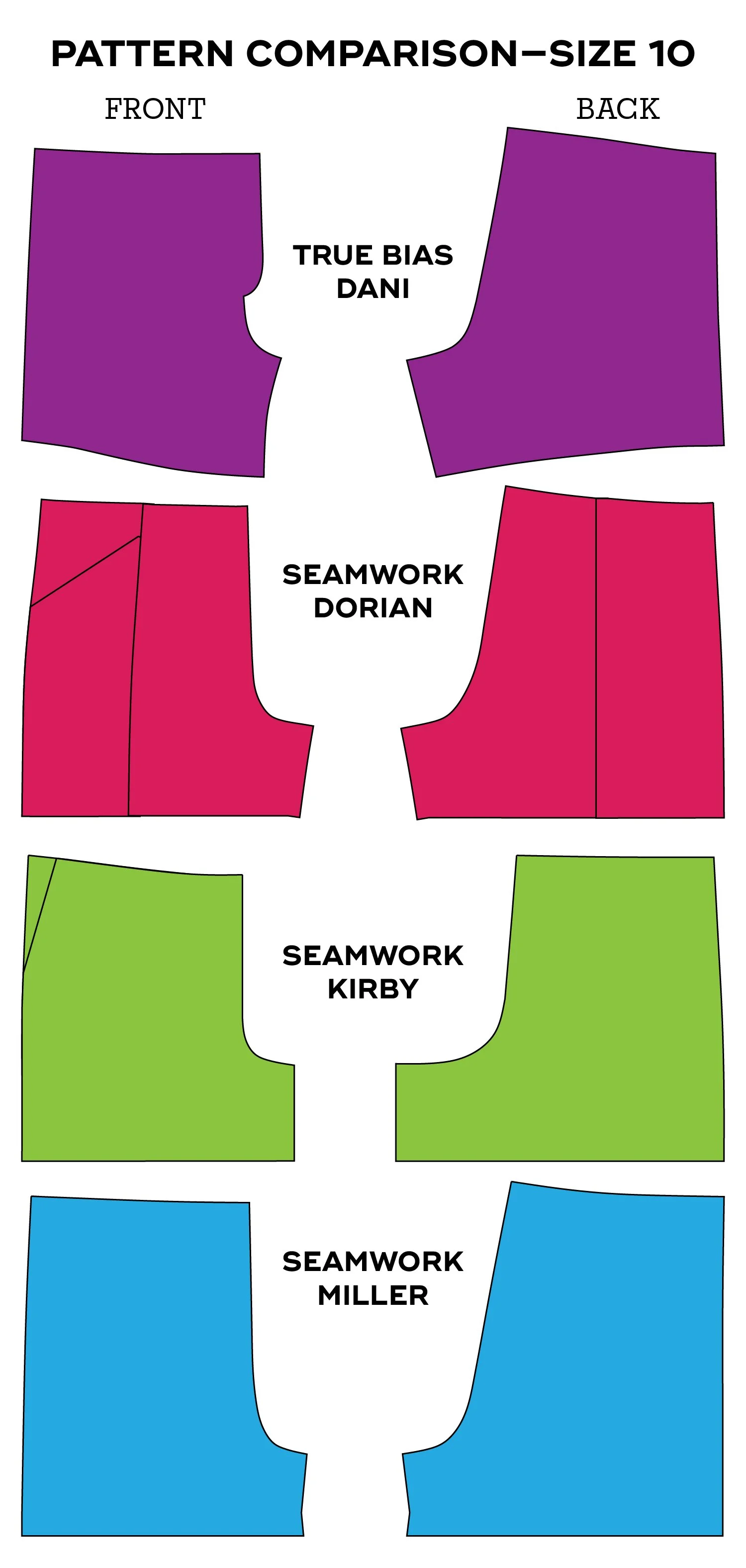 Above is a graphic showing the different patterns. These are all a size 10 with the front on the left and back on the right. It’s interesting to see how similar they all are and the nuances of how they’re different. You can see how the Kirby really have an extended back crotch, almost twice as long as the others. It also doesn’t have a curve at the back waistband.