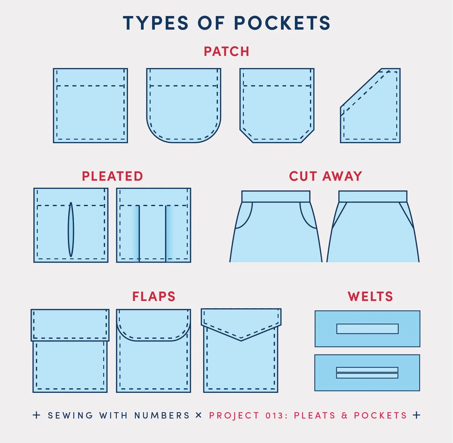 If you’re interested in drafting your own pockets, check out this post on my Substack Sewing WIth Numbers that will give you all the details. See the image above for a few of the pockets covered in the tutorial.