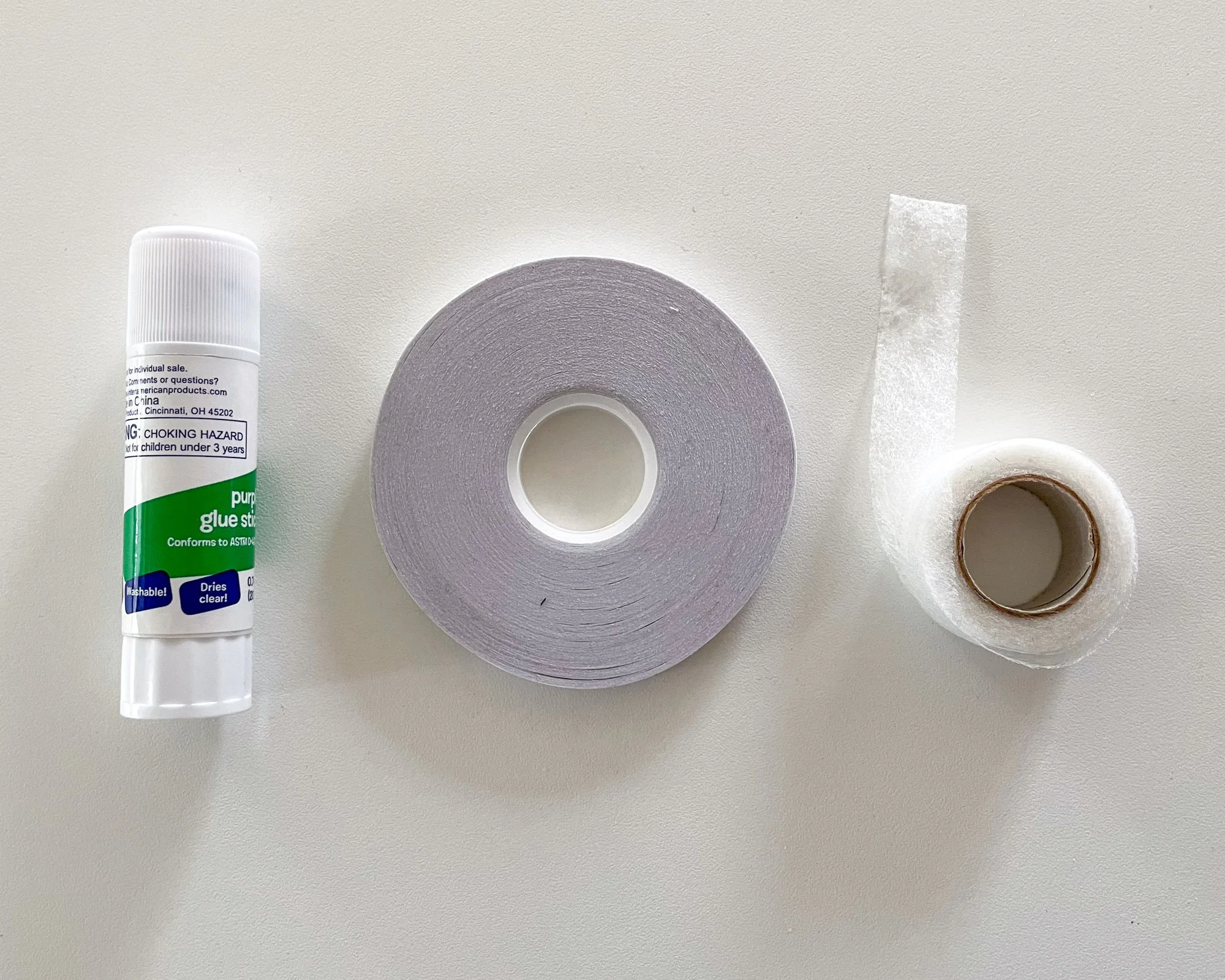 Use a glue stick or other fabric adhesive to hold the pocket in place while stitching. In the photo above are a few adhesives that I regularly use; from left, glue stick, double sided fabric tape, and fusible web tape. My favorite is a glue stick because it’s really easy to use, will wash away and it’s relatively cheap. I've never had it gum up my needle either. Alternately, you can buy wash away or permanent fabric tapes that will glue the pocket to the fabric.