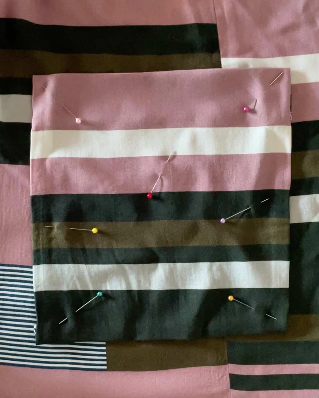 To prevent the fabric from warping out of position, instead of placing pins into the edge of the fabric, place them in the center of the pocket and pointing outwards, like a starburst.