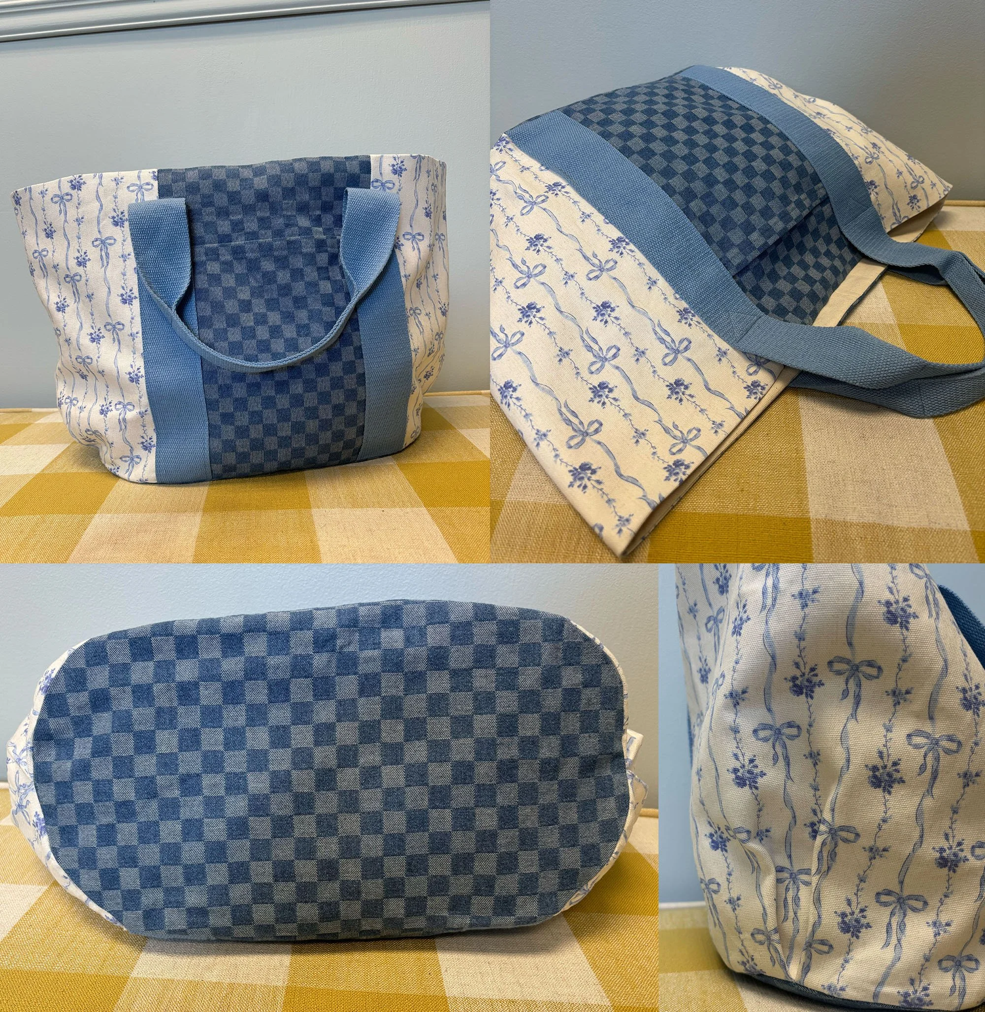 This adorable color-blocked small tote is made by Sue from @11thHouseMakes on Instagram. She adapted the pattern to make a classic boat tote style with a colored base and matching fabric handles. She shared: “A super practical tote that I know I’ll use for years!”
