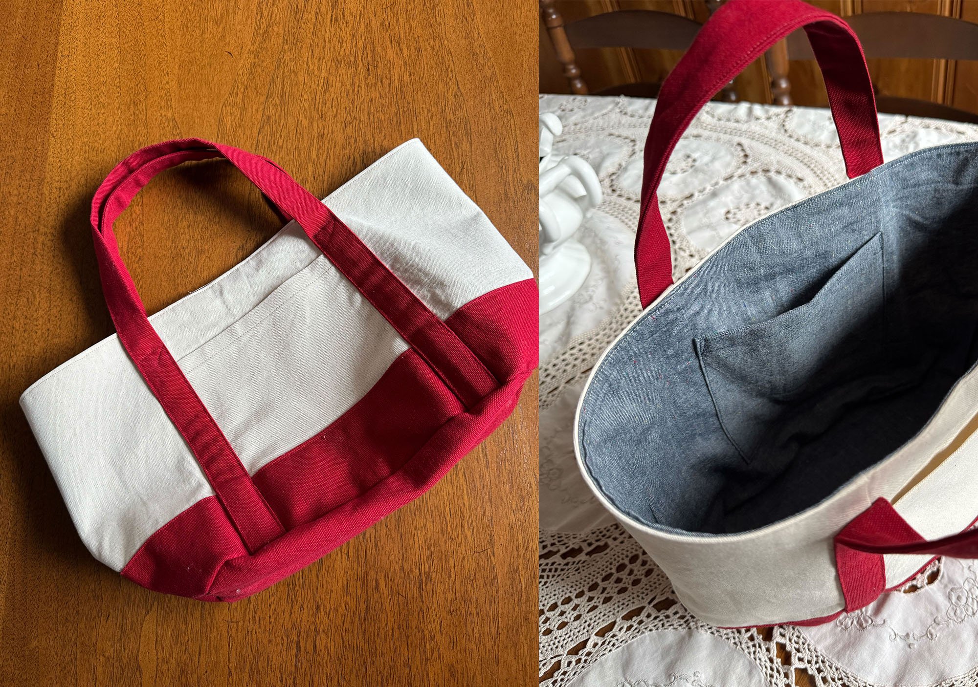 Both sizes have two exterior patch pockets and one interior pocket. The regular size has a welt zippered pocket inside and the small size has an interior patch pocket. The handles are made from cotton webbing that are topstitched to the sides of the bag and secured in the bottom seam.