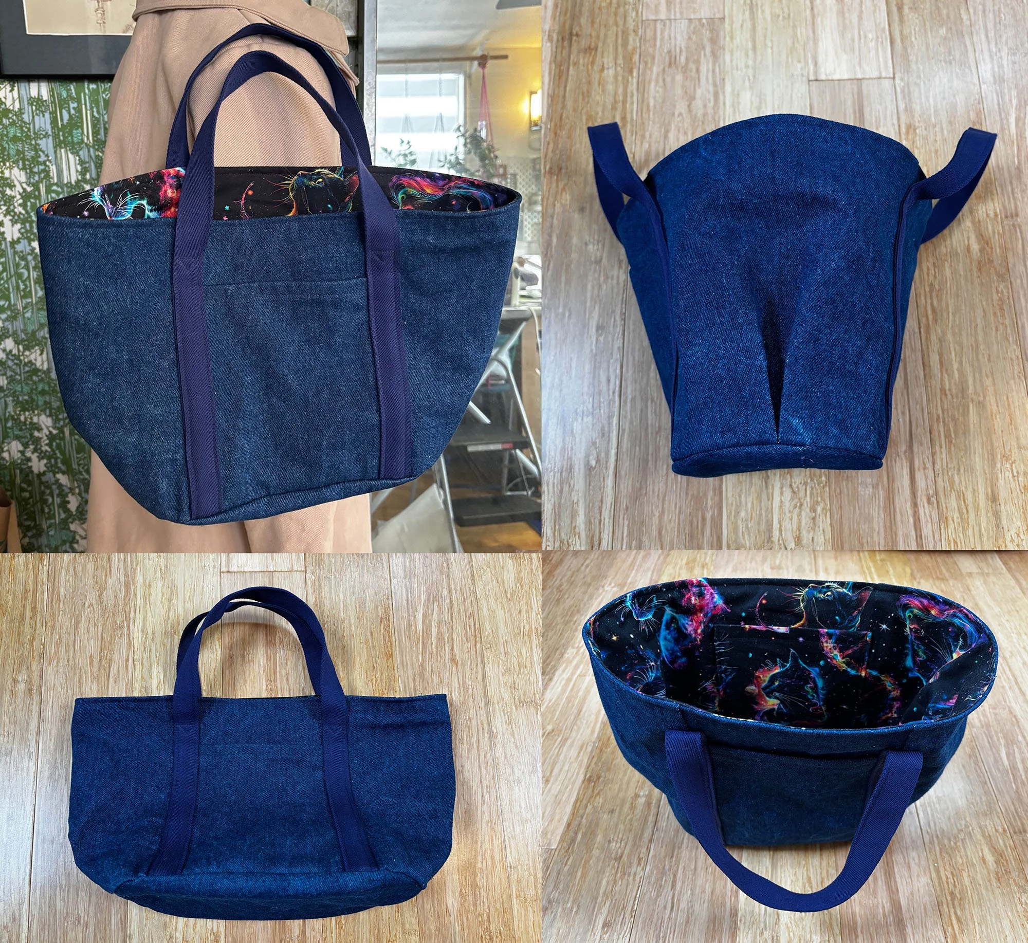 Melanie made this small size tote with denim for the exterior and quilting cotton for the lining and did not use interfacing. Check out the space cats on the lining fabric. So fun!