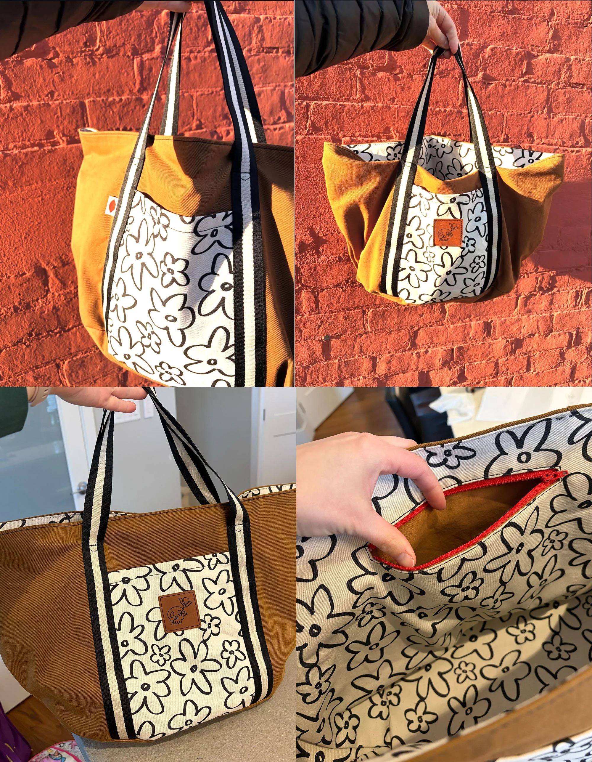 This beautiful tote was made by Katie. You can find her on Instagram at @seamsobsessed. I love the contrast between the highly patterned exterior pocket and the solid brown body of the bag. She made the regular size and used thick cotton (almost canvas) fabric and NO interfacing. The handles are actually made from belts. So clever!