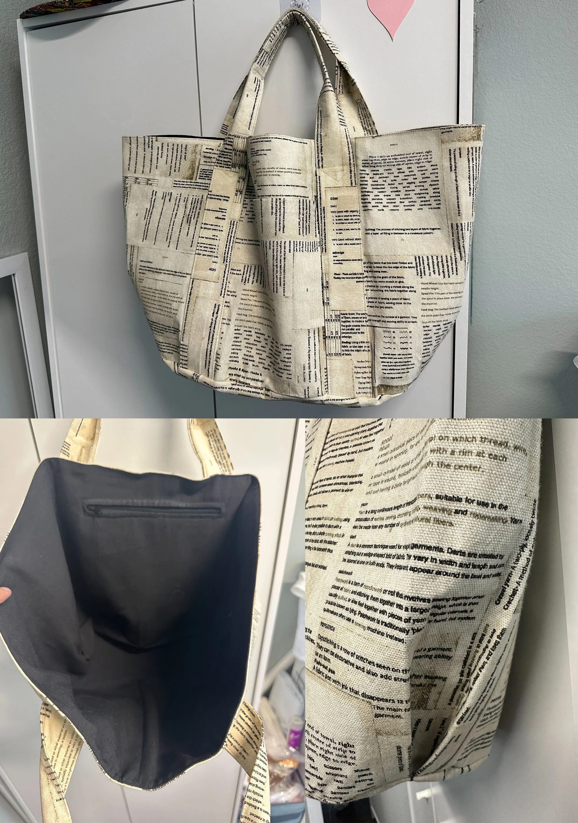 Jesara made this regular size bag using cotton canvas for both the main and outer with no interfacing. She says “I wanted a floppier bag and think it worked really well.” (I also like using two heavy pieces of fabric and no interfacing with this tote.) You can find Jesara on Instagram at @againstthegrainline.