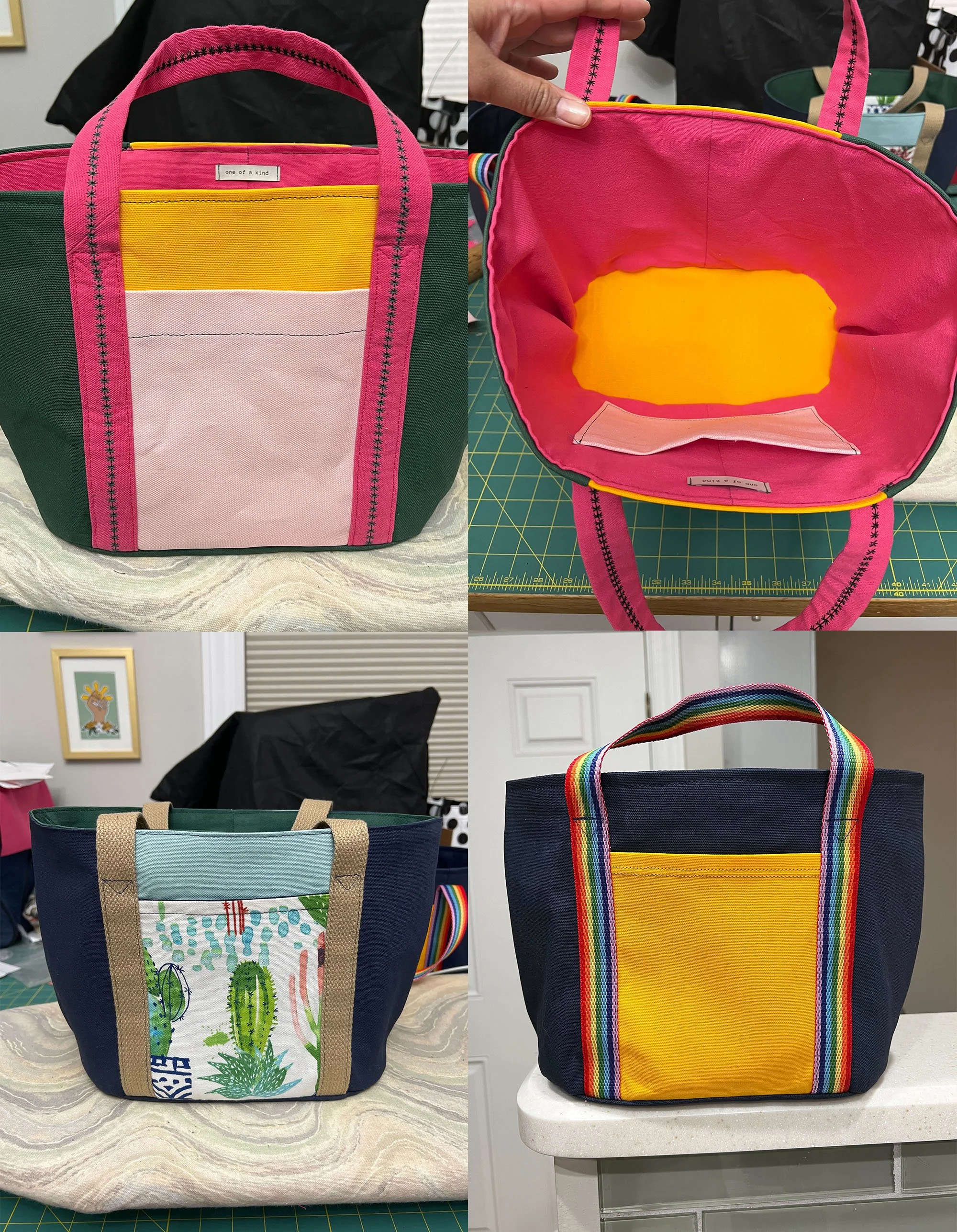 These three awesome totes were made by Nicole of @nicoleangelinesews on Instagram. These are all the small size and really show off how you can use contrasting fabric. She used cotton duck canvas interfaced with Pellon 809 for the exterior and exterior pocket. The interior bottom is cotton duck canvas, and the lining and interior pockets are soft cotton canvas. She says, “The duck canvas is already stiff, but the 809 helps it stand up on its own, and the bag itself is still very lightweight.”