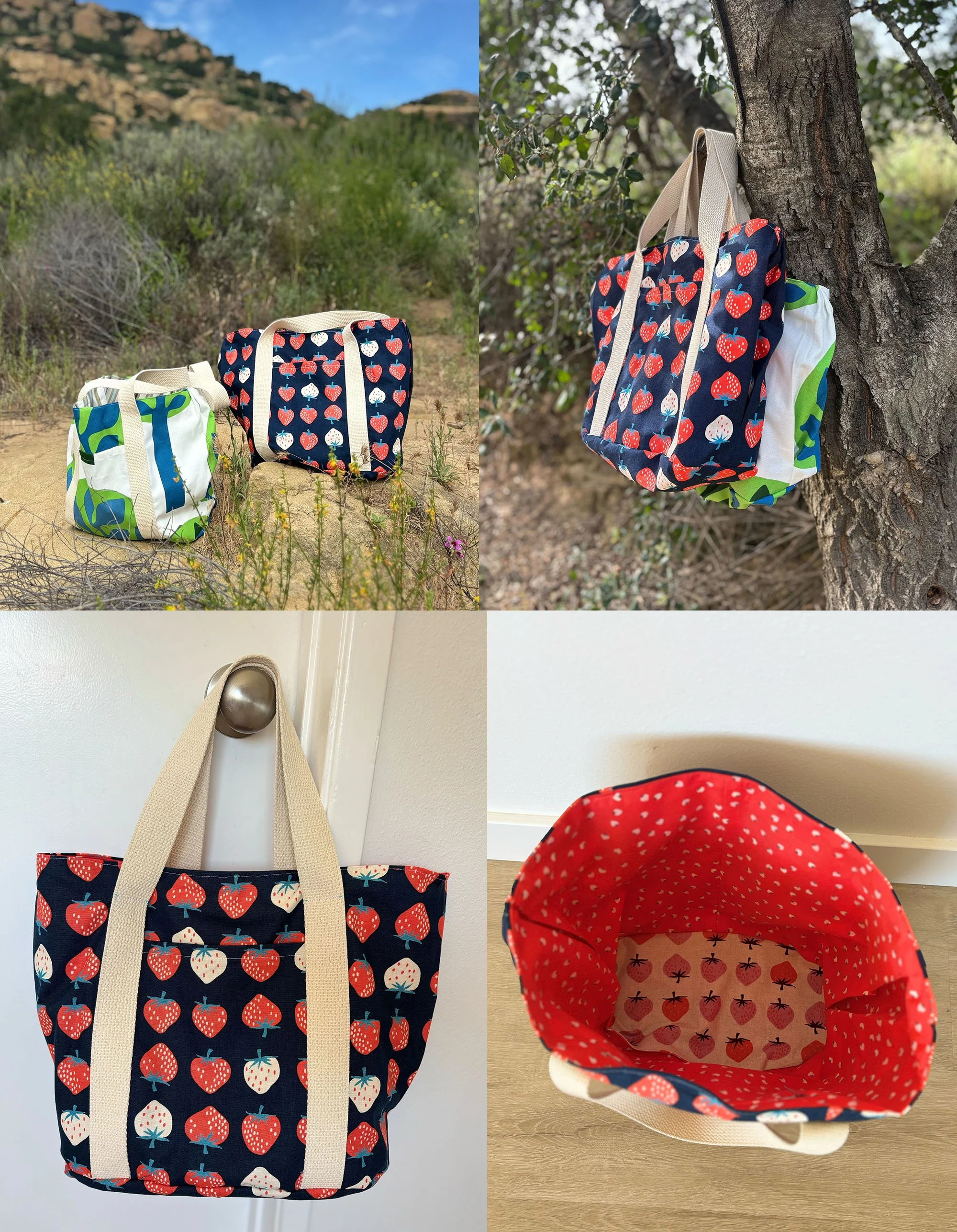 These adorable totes are made by Kirsten from @readrunsew on Instagram She made two bags and completed them within days of the test starting! The blue/green canvas is from IKEA and the strawberry print fabric is from Quilt Emporium. (See Kirsten’s IG post here.) Kirsten used canvas for the exterior, interfaced quilting cotton for the interior lining and pocket lining, and canvas for the lining bottom. She says the bag stands up on its own, but isn’t too stiff.