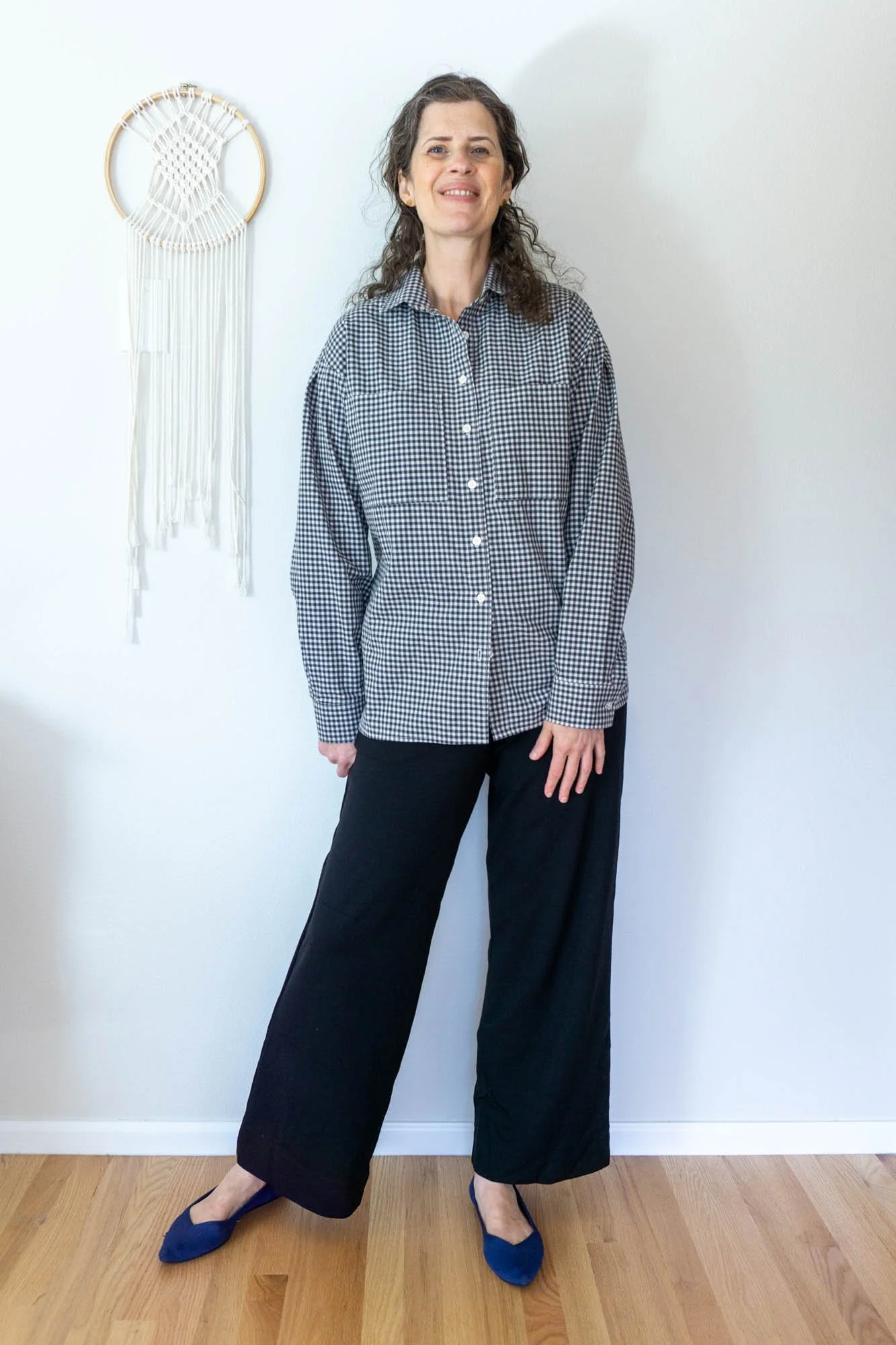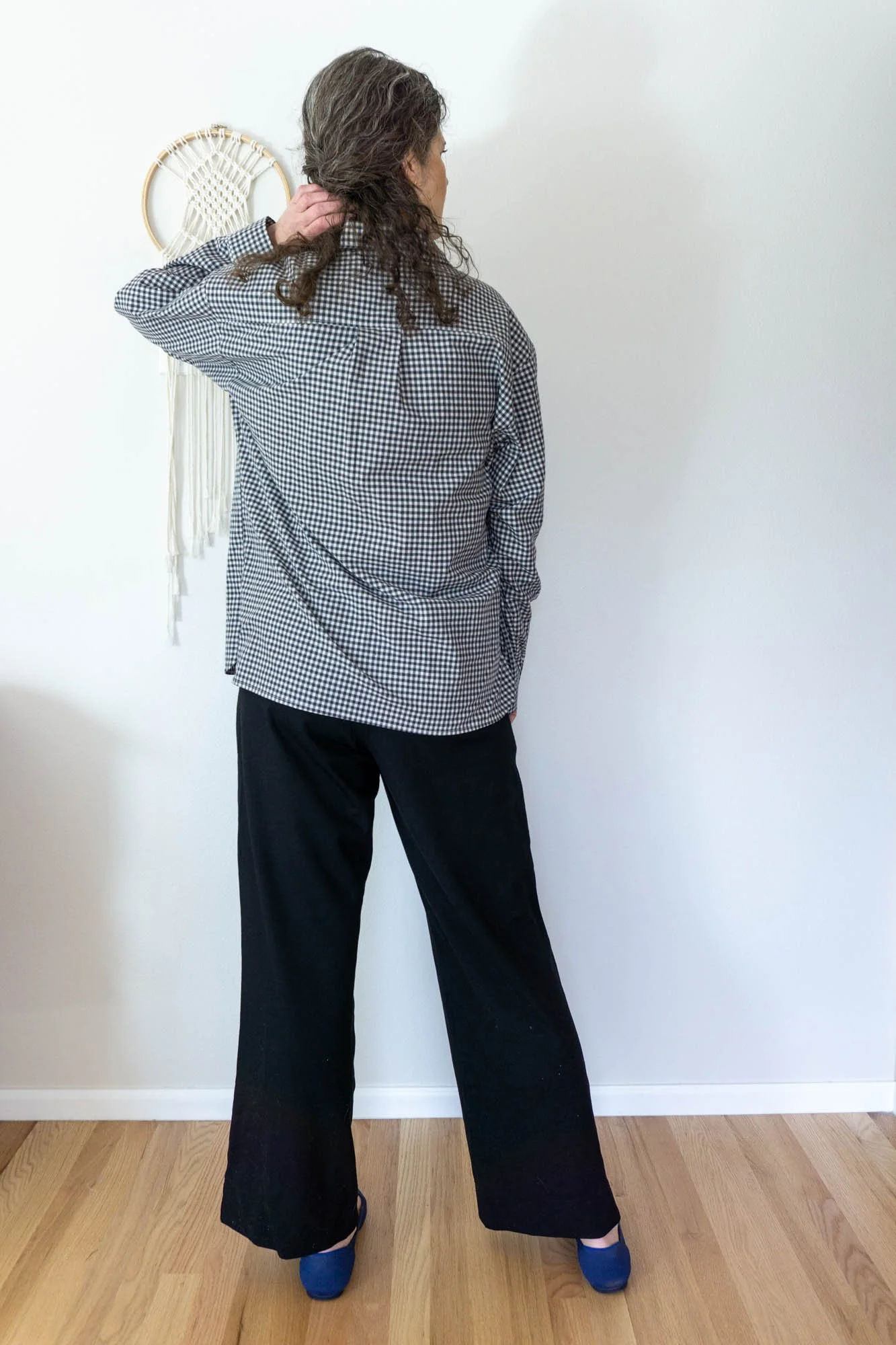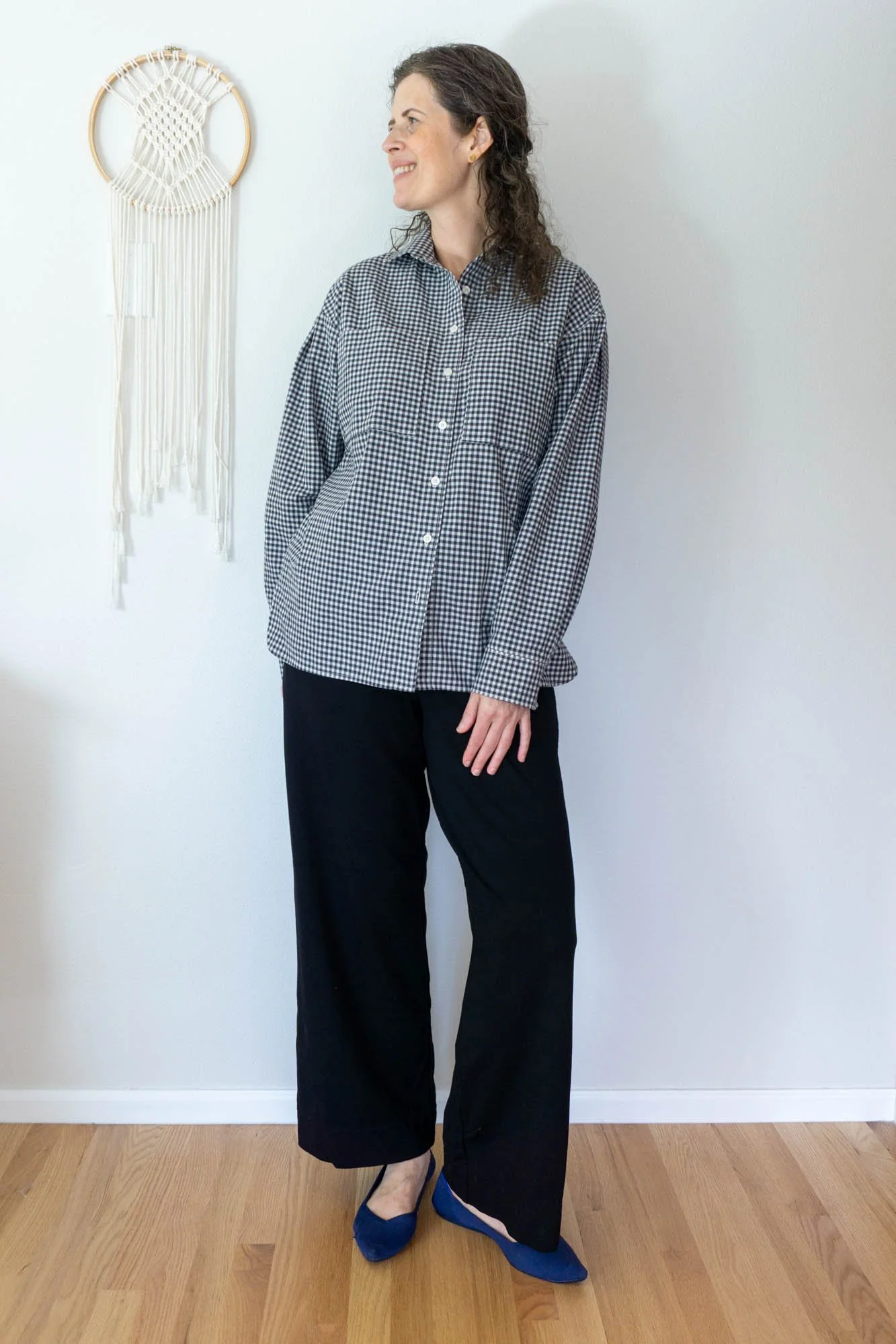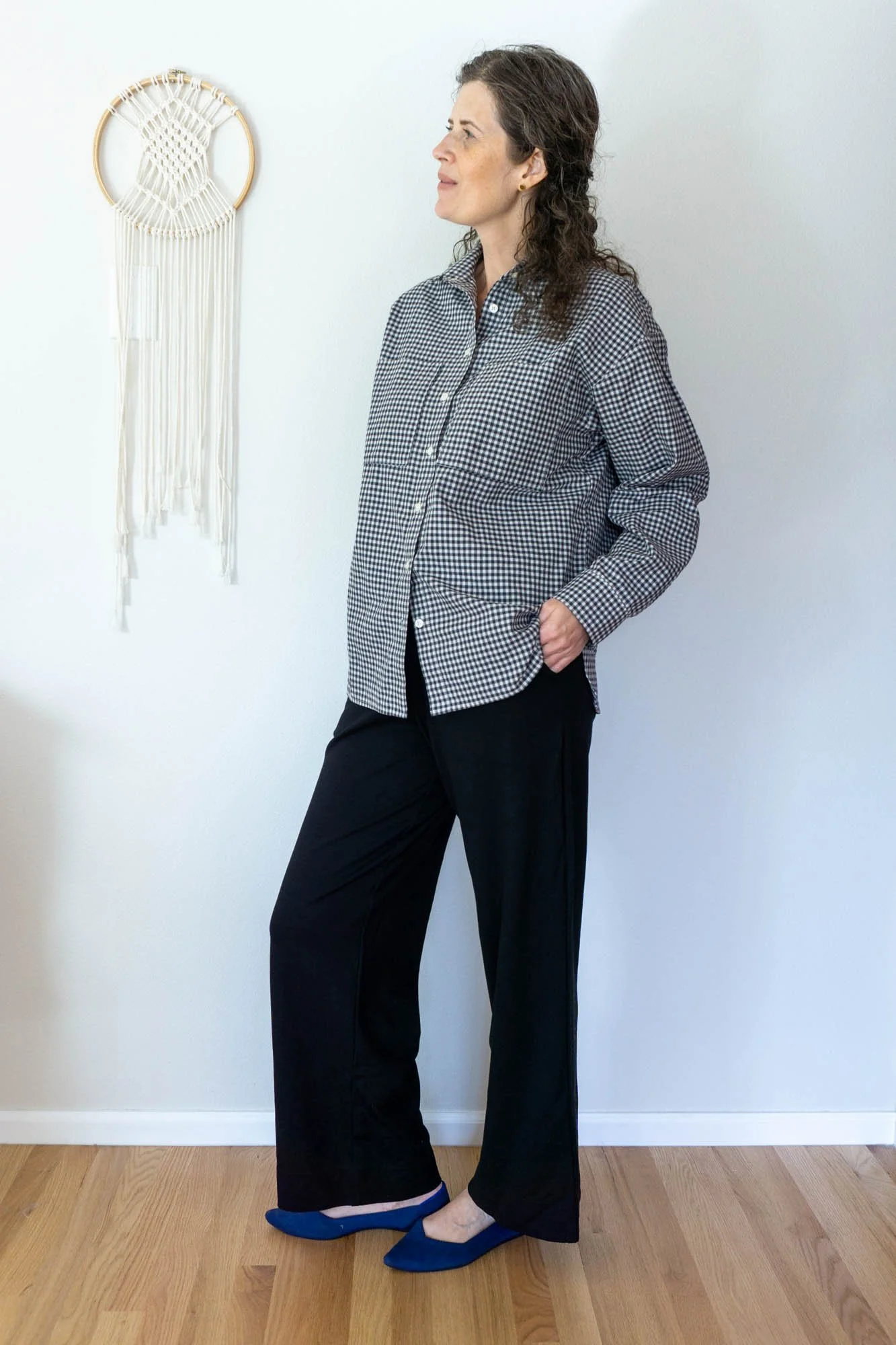 The first garment is a pair of Jodi Wide-Leg Knit Pants in black ponte. This is a pattern that I released last year and one that I wear frequently. The waistband of the Jodi Pants is designed with a medium rise, so they sit below the natural waist, just below the belly button. Personally, I find this position more comfortable than a high rise pant. This pattern is designed to be both stylish and comfortable, making it perfect for plane travel. I also think these pants work well for out and about activities in place of slacks or jeans.